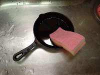 ①洗剤で洗う スキレットは、本来は洗剤で洗わない物。しかし、購入直後は塗られている錆び止めを取るために裏、表、取っ手と鍋全体を洗剤で洗う。洗剤をスポンジに付け3回程度洗うといい。 |