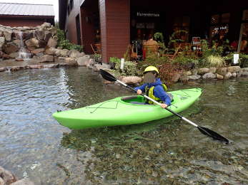 モンベル(mont-bell)ショップ前に池があり、そこでモンベルが実施しているカヤック体験ができます。カヤックは2隻あり15分単位で行っています。土・日・祝日に実施されていて一人500円。 一見、大人ならば恥ずかしさを感じる場所なのですが、子どもはそんなことはおかまいなし。ワンコインで15分のカヤック体験ができるのは、個人的にはおすすめです。 子どもたちも大満足していました。はじめは、狭すぎるのではないかと思う池なのですが、はじめて体験するのにはちょうど良い池なのかもしれません。 インストラクターの人が、パドルの持ち方や漕ぎ方、カヤックへの乗り方、ジャケットなどのつけ方などをサポートしてくれるので安心でお得感があります。