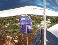 五番目に配置したのが、ドライネット。洗った食器などを入れて、水きりや乾かすのに利用する。基本的、何処でも良いのだが乾きやすいところや邪魔にならないところがいい。 私は、いつもタープポールを利用するので。今回は、一番人が通らない裏のセンターポールにかけた。ドライネットは、食器などを入れる作業がしやすい比較的高い場所に設置するほうが便利がいいよ。 |