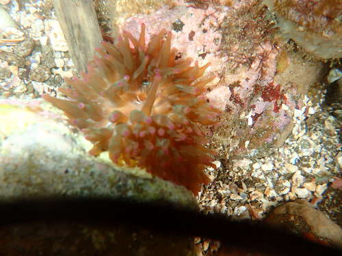 サンゴイソギンチャクサンゴイソギンチャク お~サンゴイソギンチャクを見つけた!普段は、磯から少し離れた海中で見るのだが、ここでは磯のタイドプールで。トンボロ時間帯での産物なのか?先が少し膨らんでいるものもあるのでオオサンゴイソギンチャクではないと思う。とにかく、磯で見れるとは思わなかった。 |