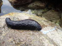真鶴半島 三ッ石海岸でもよく見られる「ニセクロナマコ」。一見クロナマコかと思ってしまうのだが、簡単な見分け方は、ニセクロマナコは、写真の通りキュビエ器官を持つ。ニセクロナマコは外敵に襲われた時にキュビエ器官を出す習性がある。体を少し刺激すると写真のように、肛門から内臓の白いキュビエ器官を出す。