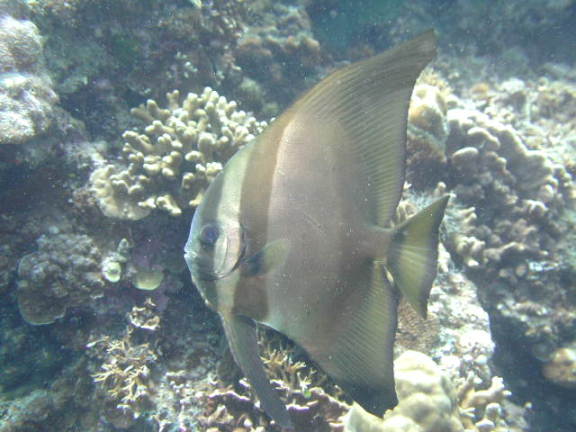 和名:ツバメウオ 写真のツバメウオは、成魚に近い。成魚は、円形で強く側扁し体が高い。臀鰭と背鰭は翼状に延長し大きい。体色は灰色で2・3本の暗色横帯がある。腹鰭の下に暗色斑がある。成魚は沿岸の中層に大きな群れを作って泳いでいる。 |