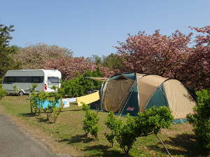 第4オートキャンプサイトは、唯一電源があるサイトです。海側に森林があり海は見えませんが、春には八重桜の下で花見キャンプができ、サイトも平坦で広めになっていてゆっくりと過ごせます。 周りにある木々が防風林的な役割をし海側からの風の影響をほとんど受けないようなエリアになっています。区画間にも小さな木が植えてあり隣の区間とのプライベートも保てます。 また、管理棟、芝生広場、シャワー棟、トイレ、水場などの各施設も比較的近くにあります。