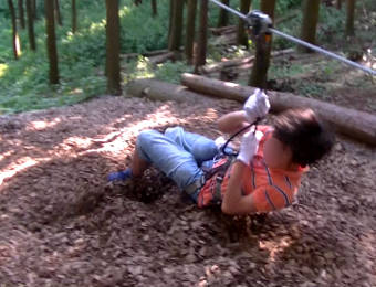 コース②は、ひねりのきいたハシゴがおもしろい。はしごが回って後戻りする。その後には、いきなりパーク内で2番目に長い130mのジップラインが体験できるコース。森に向かって飛んでいるような感覚が味わえる。