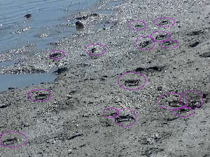チゴガニ江奈湾と同様、小網代湾の干潟にも「チゴガニ」がいっぱいいて、ウェービング(カニダンス)をあちらこちらでしているのを見ることができる。人が近づくとすぐに穴に潜ってしまうのでそっと観察しよう。チゴガニは、白いハサミと水色のかをが目立つのですぐにわかるカニだ。チゴガニのウェービング(カニダンス)は、一連の動きをすばやく休みなく続けるのが特徴。雄のみが行うため、雌に対するディスプレイで他の雄個体に対する威嚇であると考えられているが定かではないとのこと。 |
