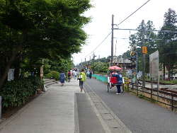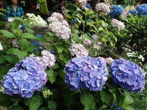 ⑪竹林と鎌倉石の参道の間 鎌倉石の参道から入口に向かって降りるときの両側にも多くのあじさいが咲いている。比較的人が少なくあじさいをバックに記念撮影している人が多い。 |