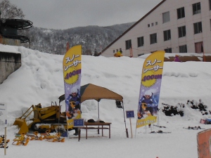 舞子スノーリゾートのソリ専用コースは、ゲレンデ内の「舞子高原ロッジ」前にあり、そこでスノーレーサーのレンタル受付のテントがある。写真のように、旗が立っているので迷うことはない。