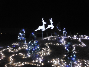 ![]() 「トナカイの森2」 まるで二匹のトナカイが飛んでいるように見える。おそらく、オブジェのイルミネーションと地表のイルミネーションのうまいかけあわせでうまく表現しているのだろう。 |